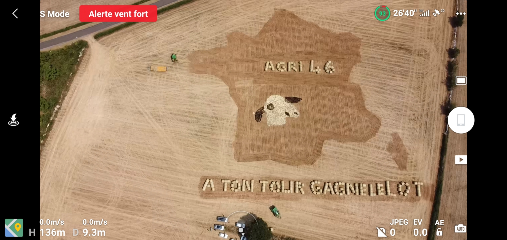 Couzou était également le lieu du visuel vu du ciel proposé par les agriculteurs du département dans le cadre du concours national organisé par la FNSEA. Une carte de France au milieu de laquelle trônait une brebis « causses du Lot » réalisée en laine noire et blanche L’ensemble a été réalisé à partir de matériaux et techniques 100% naturelles : déchaumage pour réaliser la carte de France, bottes de paille pour écrire le slogan et laine noire et blanche pour symboliser l’animal phare du département.