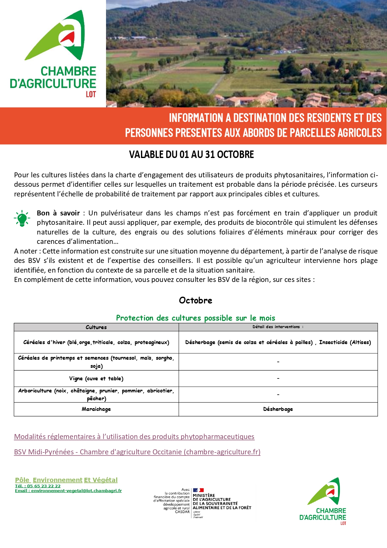 Agriculture octobre 5, 2025 Aucun Commentaire 27 Bulletin phyto du mois d’octobre Information à destination des résidents et des personnes présentes aux abords de parcelles agricoles