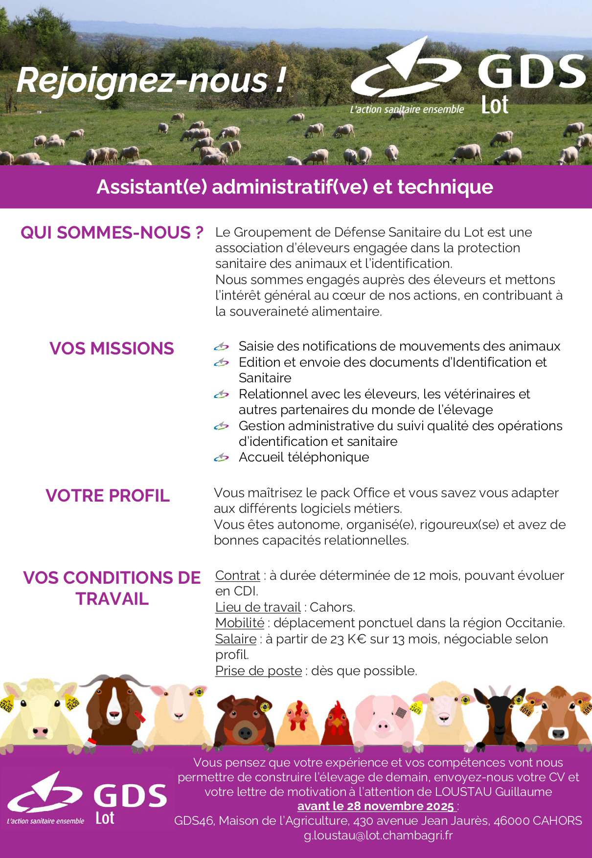 Actualité novembre 5, 2025 Aucun Commentaire 290 Offre d’emploi : assistant(e) adminstratif(ve) et technique (Groupement de défense sanitaire du Lot)