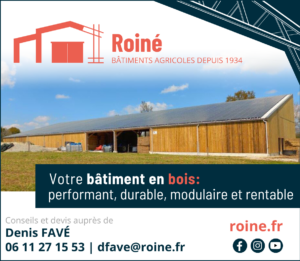 Depuis plus de 90 ans, Roiné conçoit, fabrique et installe des bâtiments agricoles et équestres en bois massif partout en France. Qu’il s’agisse de petites ou grandes exploitations, avec ou sans local de transformation ou de vente, le constructeur adapte ses solutions à chaque projet, tout en maîtrisant les coûts. Contact : www.roine.fr / 02 99 96 61 40