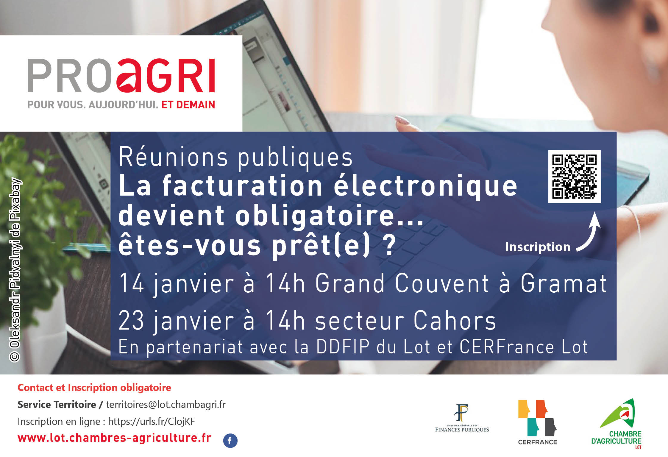 Pour vous accompagner, la Chambre d’agriculture du Lot, en partenariat avec la DDFIP du Lot et CERFrance Lot, vous invite à une réunion publique d’information afin de vous présenter les nouvelles obligations et répondre à toutes vos questions.